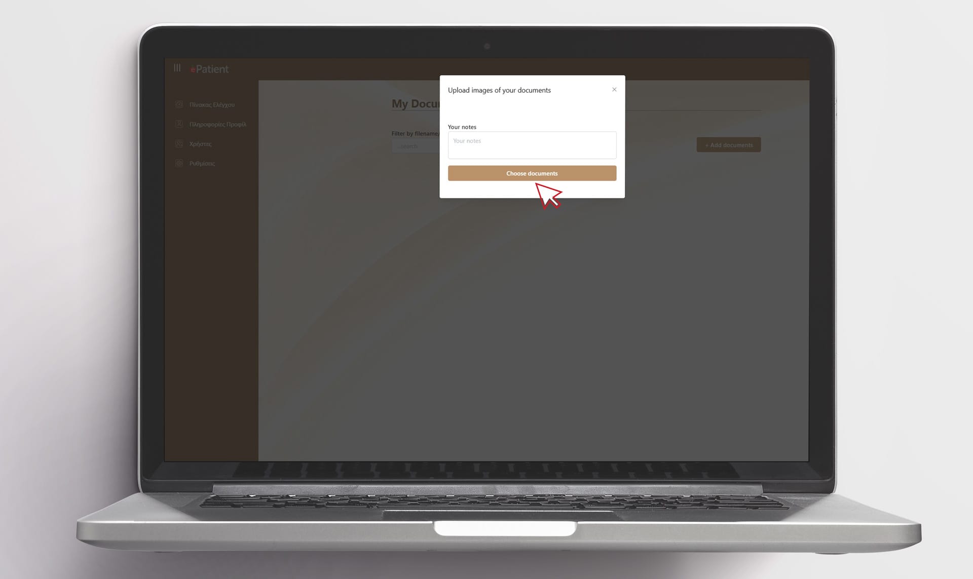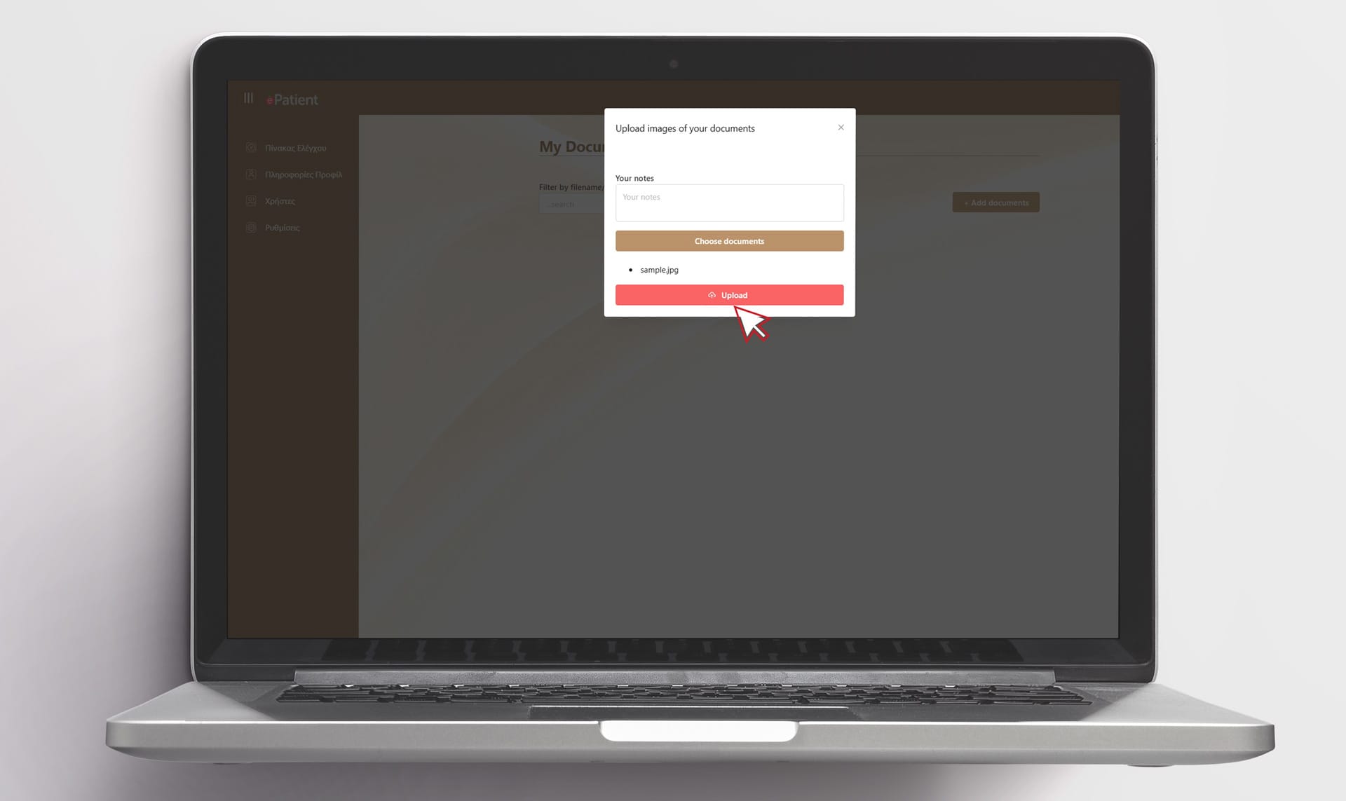 Εφόσον ολοκληρώσετε τη συμπλήρωση της φόρμας ασθενή, μπορείτε να ενημερώνετε το σύστημα με τις εξετάσεις σας. Πατήστε το σύνδεσμο “Τα αρχεία μου” και ανεβάστε τις εξετάσεις σας είτε σε μορφή εικόνας τύπου .jpg, .png είτε σε μορφή εγγράφου τύπου .pdf. Προαιρετικά μπορείτε να προσθέτετε σημειώσεις για κάθε αρχείο που ανεβάζετε. Η διαδικασία μπορεί να επαναλαμβάνεται κάθε φορά που θέλετε να ενημερώσετε το ιατρείο με τις νέες εξετάσεις που έχετε υποβληθεί.